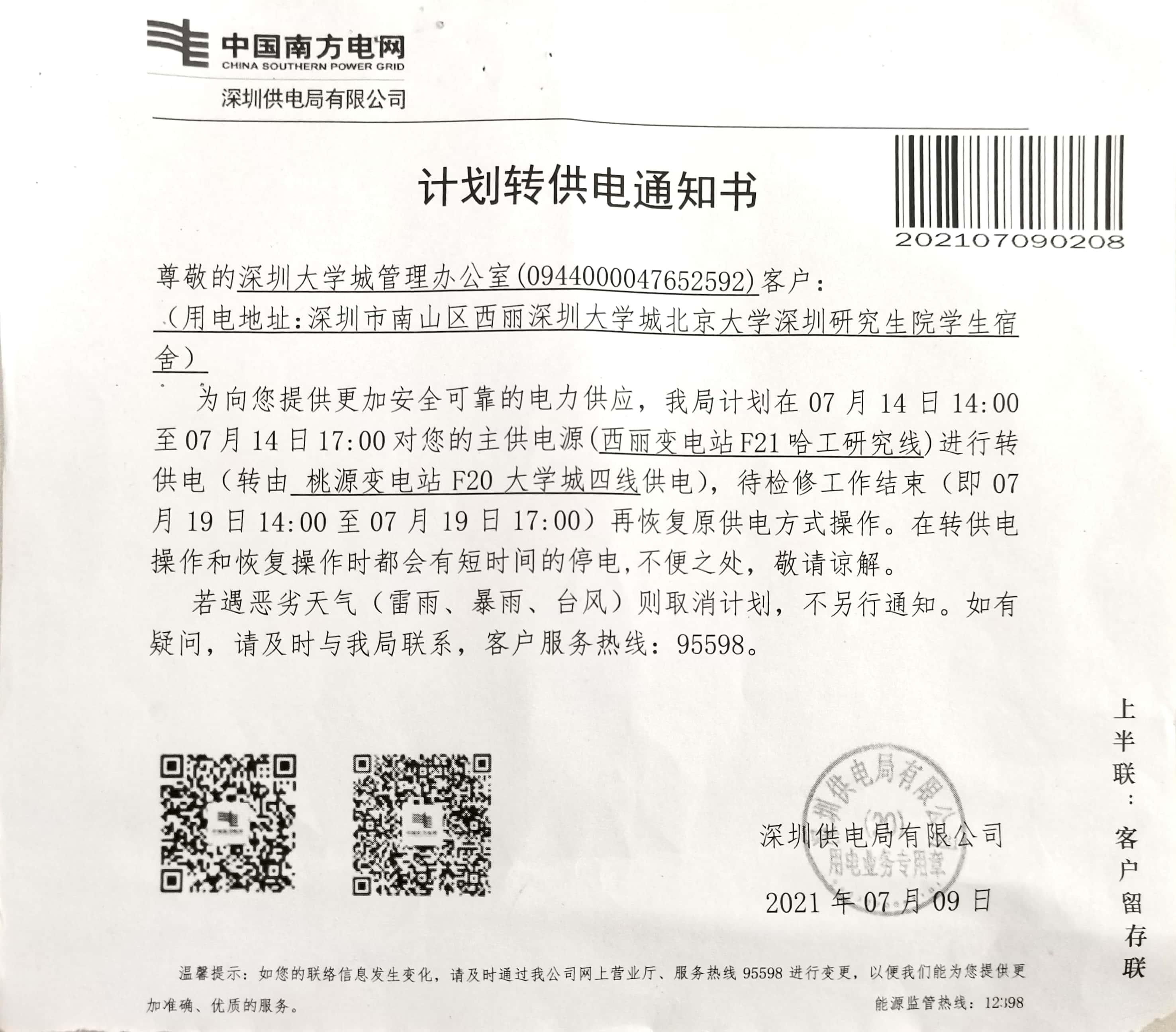 图书馆接到深圳供电局通知,计划于2021年7月14日14:00-17:00对图书馆主供电源进行转供电,待检修工作结束后,再于7月19日14:00-17:00期间恢复原供电方式。在转供电操作和恢复操作时都会有短时间的停电,图书馆在此期间正常开馆,但自助服务设备将提前暂停服务,以免设备故障。短时停电期间请广大读者不必慌张,也不要携带图书出馆,出入口保安将进行检查。给您带来不便,敬请谅解!
