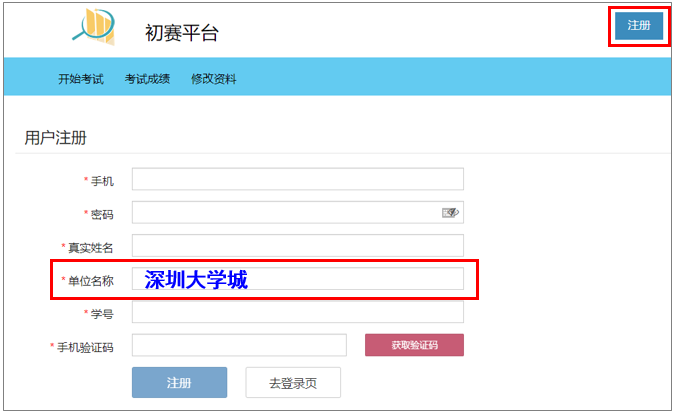 2、进入初赛平台,点击页面右上角注册(手机号注册,注册时单位名称选择“深圳大学城”);