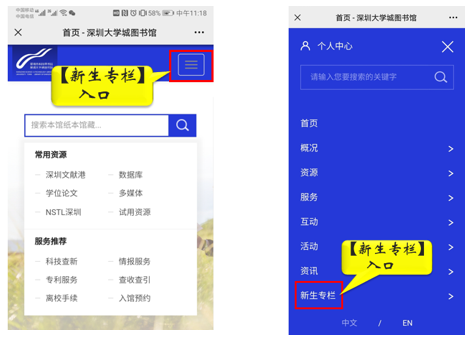 【新生专栏】微信公众号入口:深圳大学城图书馆微信公众号【首页】-右上角【导航按钮】-【新生专栏】