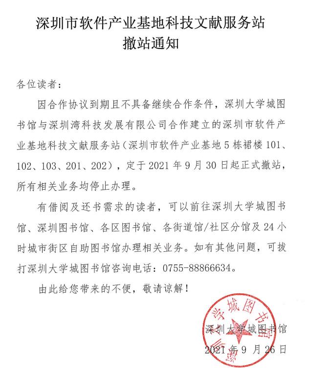 因合作协议到期且不具备继续合作条件,深圳大学城图书馆与深圳湾科技发展有限公司合作建立的深圳市软件产业基地科技文献服务站(深圳市软件产业基地5栋裙楼),定于2021年9月30日起正式撤站,所有相关业务均停止办理。有借阅及还书需求的读者,可以前往深圳大学城图书馆、深圳图书馆、各区图书馆、各街道馆/社区分馆及24小时城市街区自助图书馆办理相关业务。如有其他问题,可拔打深圳大学城图书馆咨询电话:0755-88866634。