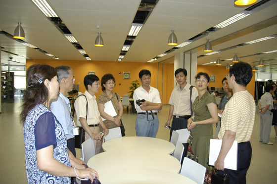 赵馆长首先在图书馆广场前对我馆的概况做了非常详尽的介绍后,并亲自引领各位馆长从二楼总服务台开始对我馆的功能布局进行了详尽的讲解。宏伟的建筑造型、现代化的室内设计、舒适的阅读环境、先进的服务理念给各位馆长留下了深刻的印象。他们在为我馆的建筑所震撼的同时,特别对我馆目前在只有72个员工仍坚持每天开馆13小时的敬业精神感到钦佩。他们沿途不时举起相机拍摄图片,表示难得遇到如此漂亮的图书馆,拍摄的相片既可作为留念又可供修建新型图书馆参考的宝贵资料。