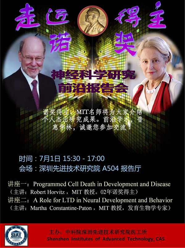 中国科学院深圳先进技术研究院医工所神经工程研究中心将于2014年7月1日15:30-17:00在先进院A504报告厅举办“神经科学研究前沿报告会”。会上,02年诺贝尔生物与医学奖获得者Robert Horvitz教授及MIT的Martha Constantine-Paton教授将介绍个人杰出的研究成果(更多信息请见下面海报)。这是一个神经科学领域前沿研究的展示交流平台,是近距离接触诺奖得主的难得良机。诚挚邀请大学城各校老师、同学们前来交流!
