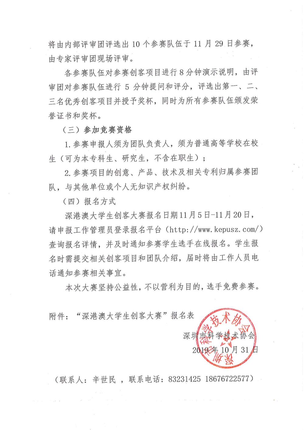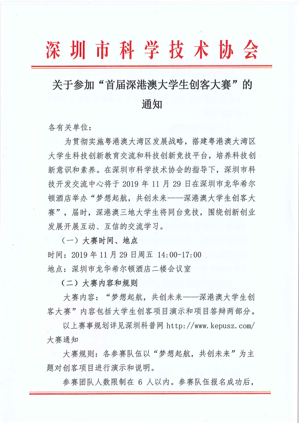 为贯彻实施粤港澳大湾区发展战略,搭建粤港澳大湾区大学生科技创新教育交流和科技创新竞技平台, 培养科技创新意识和素养。在深圳市科学技术协会的指导下, 深圳市科技开发交流中心将于2019年11月29日在深圳市龙华希尔顿酒店举办 “梦想起航,共创未来——深港澳大学生创客大赛”, 届时,深港澳三地大学生将同台竞技,围绕创新创业发展开展互动、互信的交流学习。