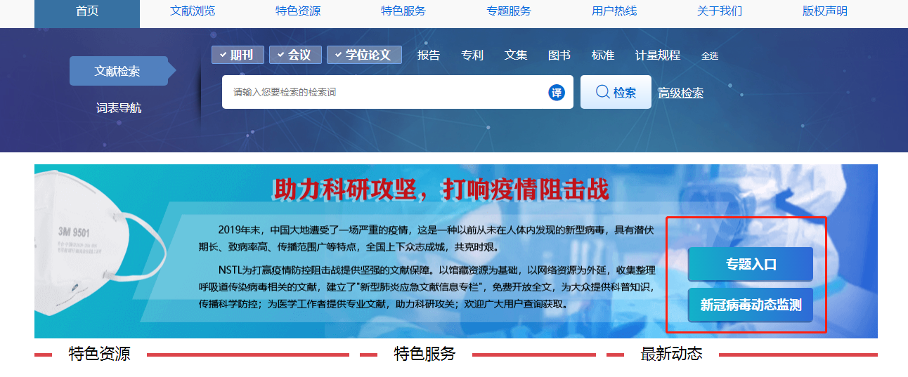 2、点击“专题入口”、“新冠病毒动态监测”即可进入专栏获取文献资源。