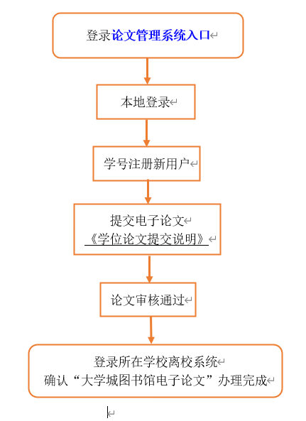 登陆 深圳大学城图书馆论文管理系统 ,上传学位论文电子版:选择“本地登录”-用“学号注册新用户”-按系统指引提交电子论文-等待论文审核通过。