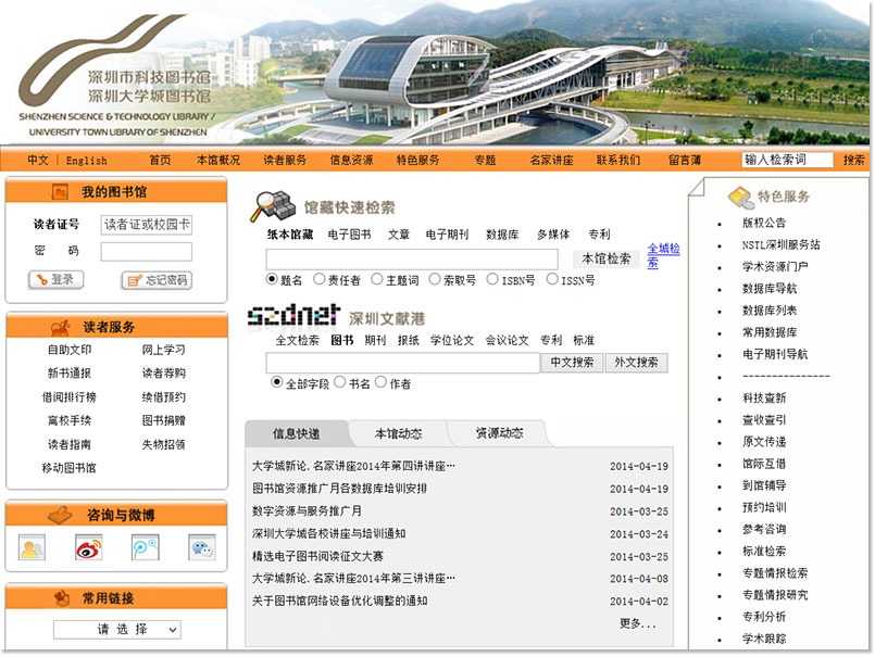 从功能上,新网站也做了很多改进:比如把检索条统一成一个,增加了学科服务平台,原来已有的功能作了改进,比如留言簿更加好用等等。