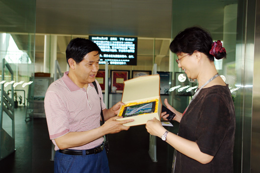此次来馆参观的四川地震灾区图书馆馆员包括绵阳市图书馆、北川图书馆、江油市图书馆、安县图书馆、梓潼县图书馆、邛崃县图书馆等9家公共图书馆。赵洗尘馆长首先与来自灾区图书馆的同仁们观看了我馆宣传片,介绍了我馆的基本情况,在随后的参观中重点介绍了我馆的布局与服务理念。北川县图书馆副馆长唐成,这位今年刚满30岁,在地震期间与怀孕6个月的妻子失去联系整整2个月的年轻人在参观过我馆后说:“你们馆很多细节都体现了为人服务的理念,这对我们工作很有启发,同时也感受到深圳市政府对图书馆建设的重视程度。一年后欢迎你们来我们馆看看,那时候一定会有很大的不同”,绵阳市图书馆馆员邬伟说:“这里的读者素质都很高,我们走过他们身边的时候他们依然专注于手中的书本,能够放弃杂念、一心沉浸的人才是快乐的。身临这样的图书馆让人的心灵变得平静”。绵阳图书馆馆长张尔君在参观中告诉赵洗尘馆长:“非常感谢我馆之前捐赠给绵阳图书馆的图书,捐赠的图书对目前补充图书馆的馆藏非常重要”。 结束简短的参观,赵洗尘馆长向学习团成员赠送了印有我馆建筑外观的纪念品,希望与大家保持联系,祝福灾区图书馆的建设。