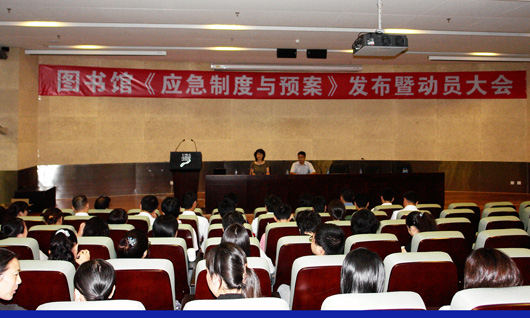 会议由图书馆党支部书记薛列栓主持,副馆长李桂芬宣读了“关于组建图书馆应急小分队、关于成立紧急情况处理小组的决定和《图书馆应急预案与制度》”三份文件。