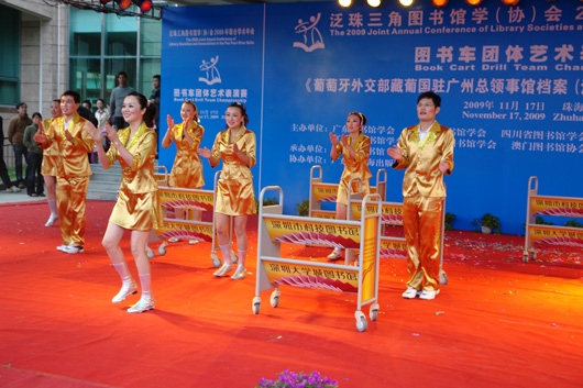17日下午,珠海图书馆广场寒风凛冽,作为会议的重要组成部分也是全国首次“图书馆书车艺术舞蹈比赛”激情上演,来自九省区图书馆的23支参赛队伍以书车为道具,自由创作,以舞蹈、音乐剧、相声、情境表演等多种以上形式进行表演,展现图书馆专业特色和图书馆员形象与精神面貌。