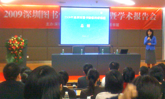 深圳图书馆馆长、学会理事长吴晞首先回顾了今年学会组织实践的两件大事:开国内之先河召开的“公共图书馆高峰论坛”和建立了国内首家以公共图书馆为主要研究内容的“公共图书馆研究院”。从宏观上概括了学会发展的成绩和明年的工作目标;接下来深圳少儿图书馆馆长、学会副理事长宋卫全面、细致地总结了2009年一年学会的实践工作;第三项是总结和梳理“2009年深圳市图书情报科研课题”结题情况,由我馆馆长、学会副理事长赵洗尘同志进行汇报。我馆馆长结合实际课题分析了深圳地区图书馆从业人员课题撰写、研究实际情况,指出课题研究要“源于实践、用于实践”、“有调查、有数据、有分析、有结论、有实践、有组织”的优秀课题需要经过的学术过程等。