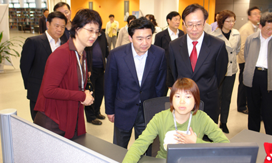 在图书馆,赵洗尘馆长就我馆的基本情况、资源建设、服务特点向王荣市长一行做了汇报。我馆是国内第一家兼具高校图书馆与公共图书馆双重职能的新型图书馆,面向大学城各院提供服务,同时也面向全市科技工作者和普通市民服务,深圳市情报所整体并入我馆增强了我馆提供专题情报分析服务的能力。秉承“一切为人的发展,为一切人的发展”的服务宗旨,着力打造集专业性、研究型、数字化、全开放为一体的新型图书馆。我馆每天开馆14.5小时,2009年年进馆读者73万人次,借阅图书近34万册次。