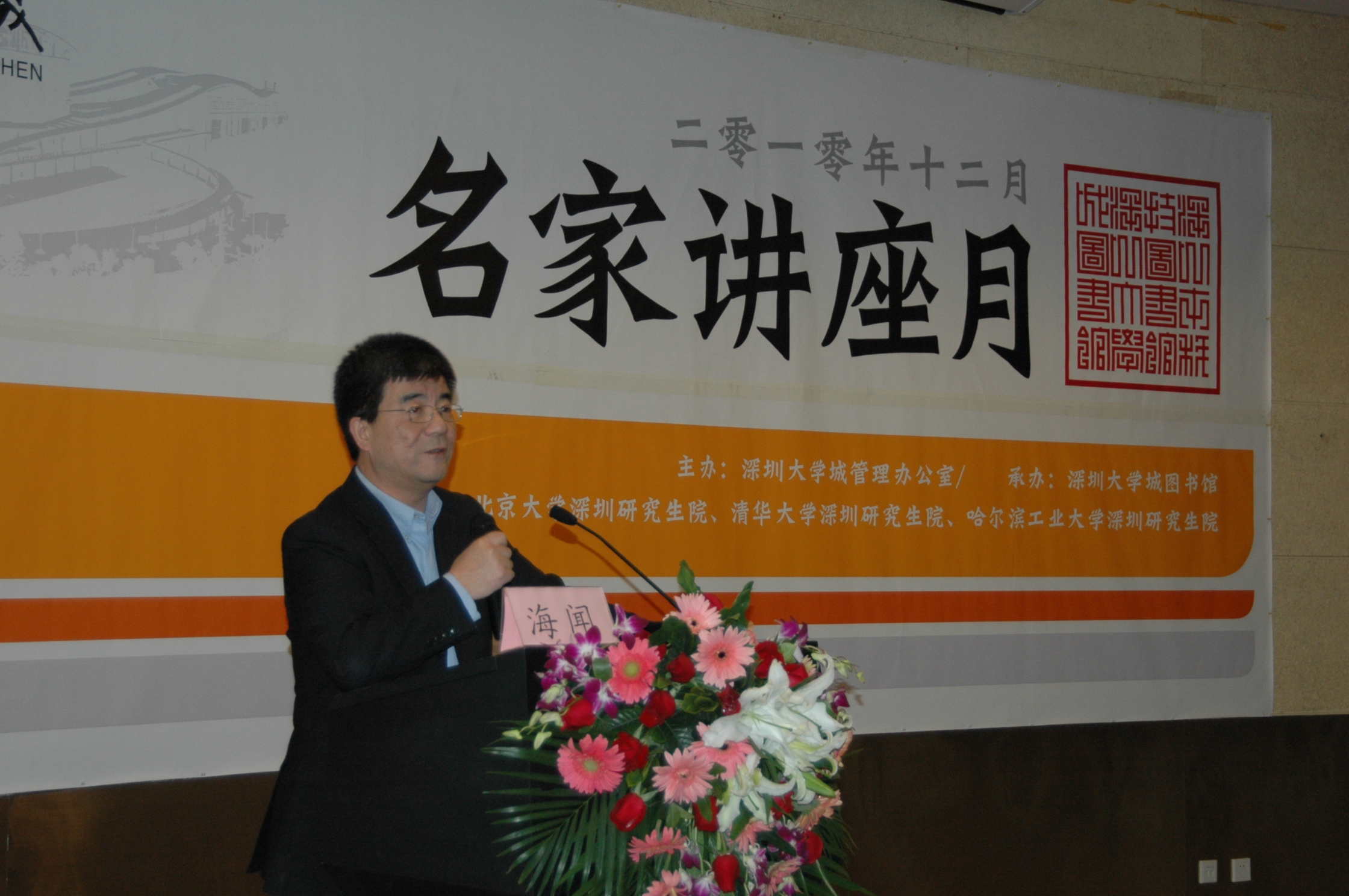 12月18日下午,深圳大学城名家讲座月的第三场讲座在图书馆四楼的学术报告厅如期举行。讲座现场座无虚席,许多读者要么席地而坐,要么伫立门口,走廊上和相邻的多功能厅里也站满了听讲的读者,场面十分火爆。