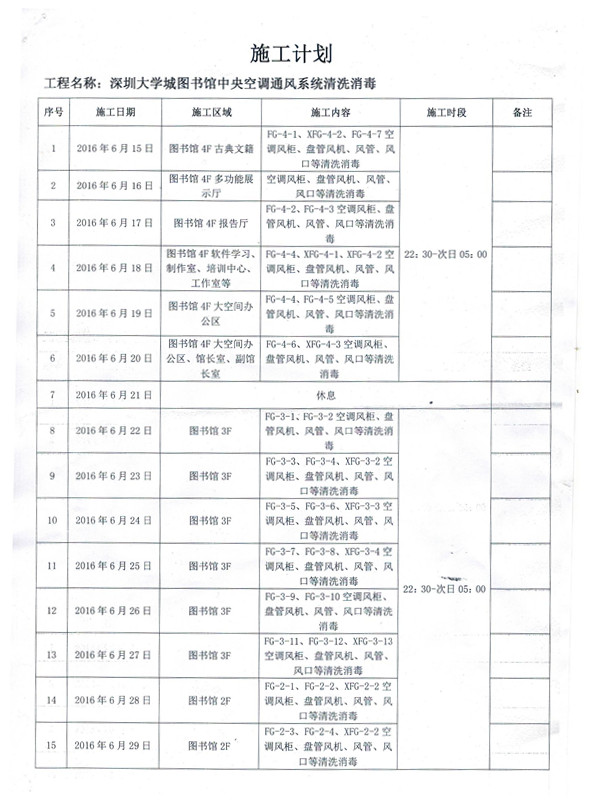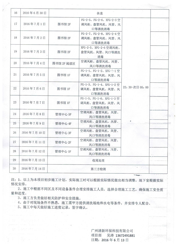 为保证图书馆阅览区优质的室内空气质量,每年在进入夏季空调使用高峰期之前,图书馆会对中央空调通风系统进行清洗与消毒。今年这项工作由广州清新环保科技有限公司中标,工期30天,计划于2016年6月15日至7月14日,分不同区域,对整个图书馆的中央空调系统进行清洗与消毒。为尽可能避免清洗消毒过程对读者的影响,这项工作都安排在每天图书馆闭馆之后进行,但也可能在部分区域会有异味,敬请广大读者监督与理解。