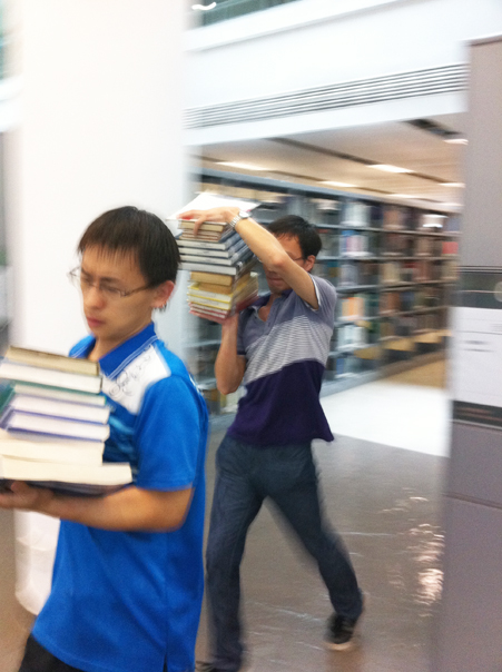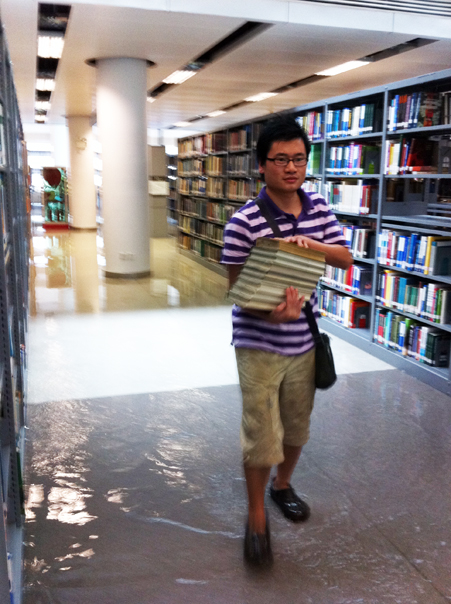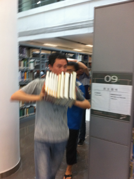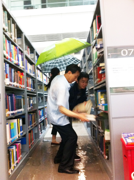 午后,深圳市迎来今年首次强降水,夹杂着雷电的降雨铺天盖地席卷鹏城,由于瞬间风力过强、降雨量特大,导致我馆3楼西文图书阅览区上方玻璃棚顶严重漏雨。在3楼阅览区自习的读者首先发现了漏雨的问题,并在第一时间告知了图书馆值班工作人员。图书馆立即启动应急预案,通知各相关人员。而此时图书馆最直接的使用者、我们最最亲爱的读者已经开始自发地搬运被雨水淋到的图书,他们行动敏捷、安静而有秩序,配合图书馆工作人员的指挥,在不到半小时时间里搬运过水图书近万册,冒着暴雨抢救了价值近500万元的西文原版图书。