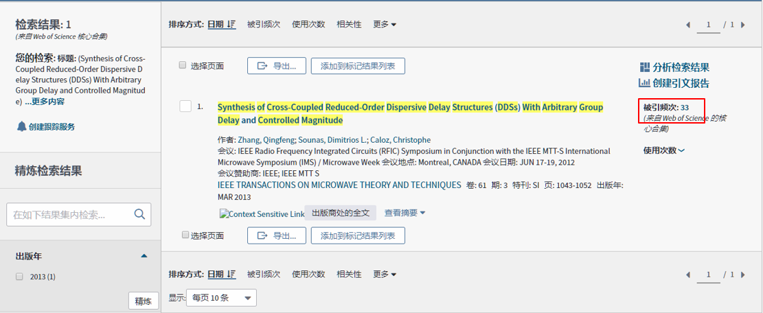 (1)进入Web of Science平台页面,限定核心合集、sci数据库后检索出文章,证明该文章确实被SCI数据库收录。