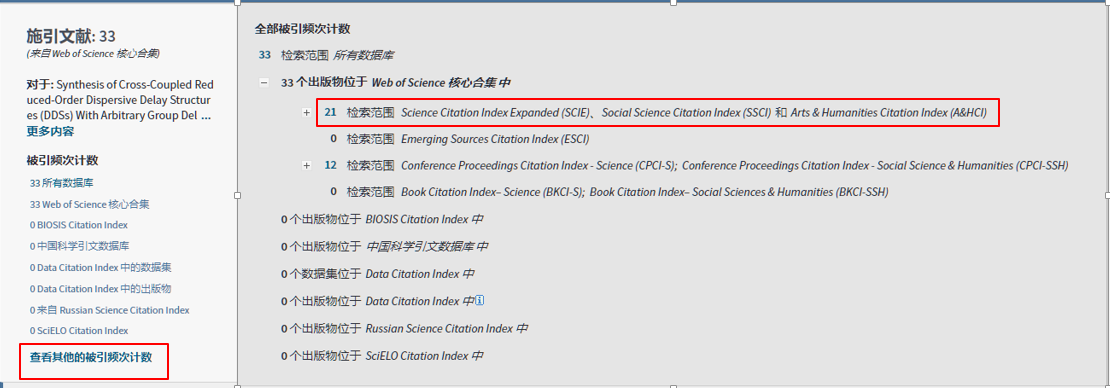 (2)点击“被引次数:33”,但是33是整个Web of Science核心合集的引用次数,包括ESCI、CPCI等其它子数据库。点击左侧“查看其它被引频次计数”后,其中的21才是SCI数据库中的总引次数。