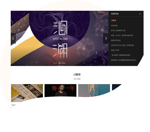 U媒体中心可以管理所有数字化资源,提供多种类型资源的规范编目和统一存储,包括名家讲座、课程参考、电影鉴赏等栏目,为广大师生读者提供音视频在线点播服务和在线课件下载。